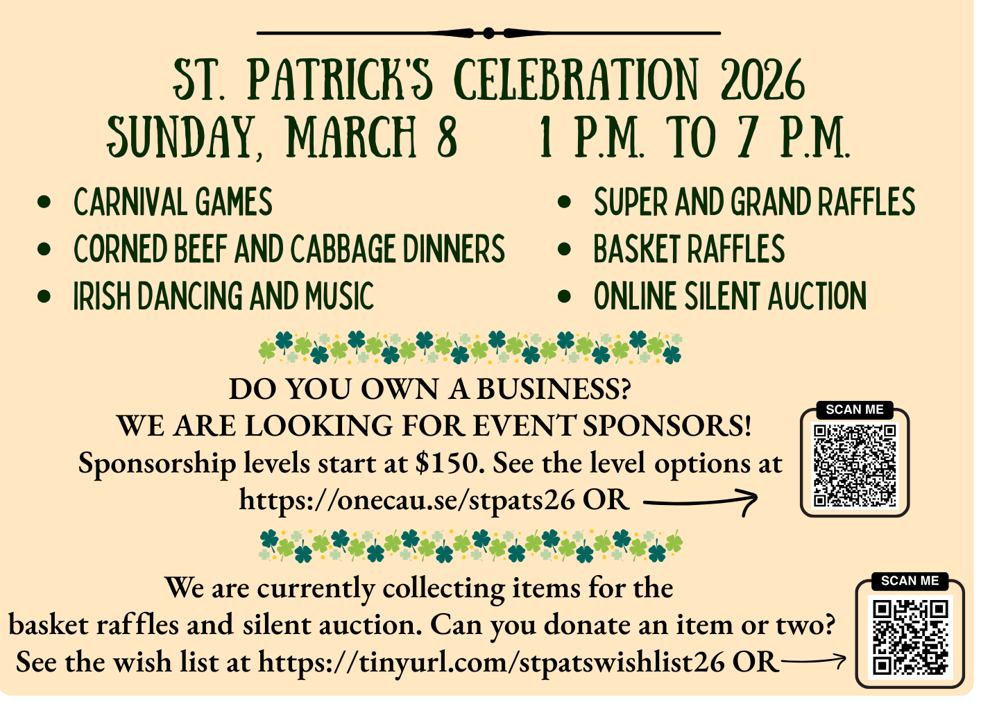 January 16, 2026 admin News Save the date for a weekend of festivities and the luck of the Irish! CLICK HERE FOR MORE INFO!