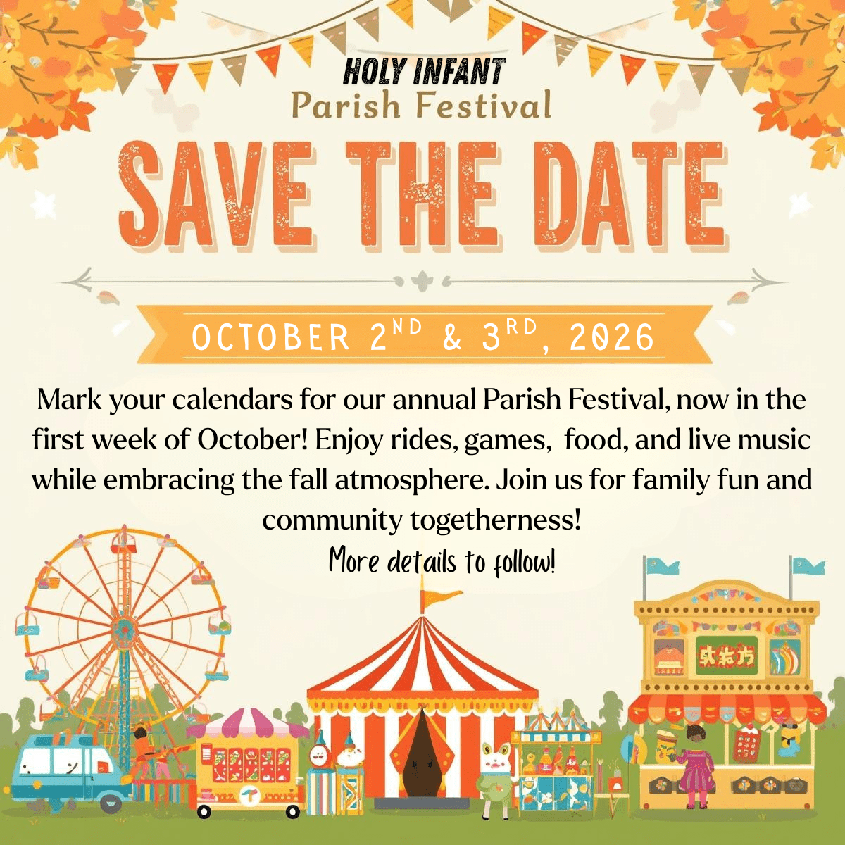 Enjoy rides, games, food, and live music while embracing the fall atmosphere. Join us for family fun and community togetherness!