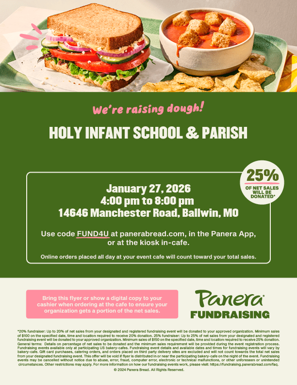 We’re raising dough! for Holy Infant School & Parish on January 27, 4pm-8pm at Panera Bread, 14646 Manchester Rd.