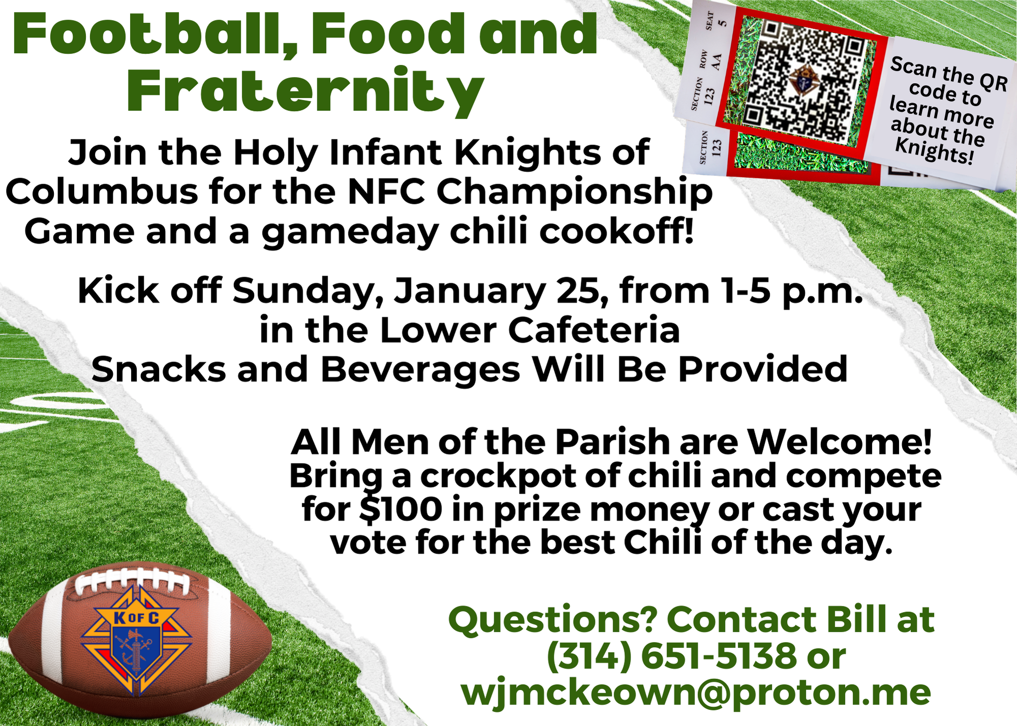 Join the Holy Infant Knights of Columbus for the NFC Championship Game and a gameday chili cookoff!