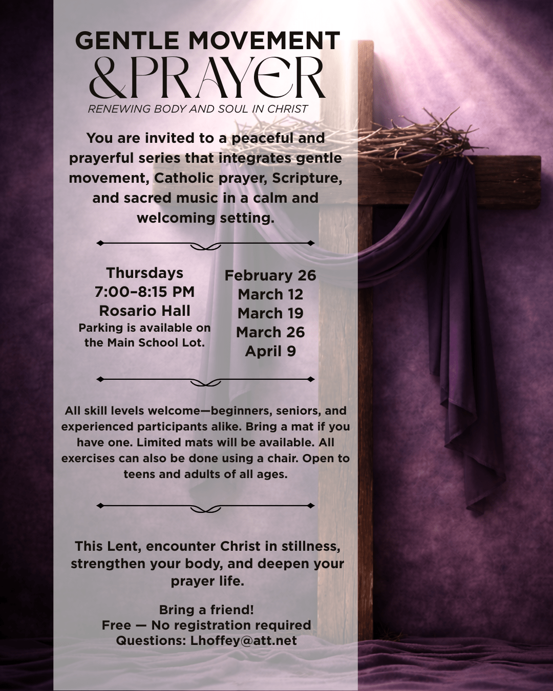You are invited to a peaceful and prayerful series that integrates gentle movement, Catholic prayer, Scripture, and sacred music in…