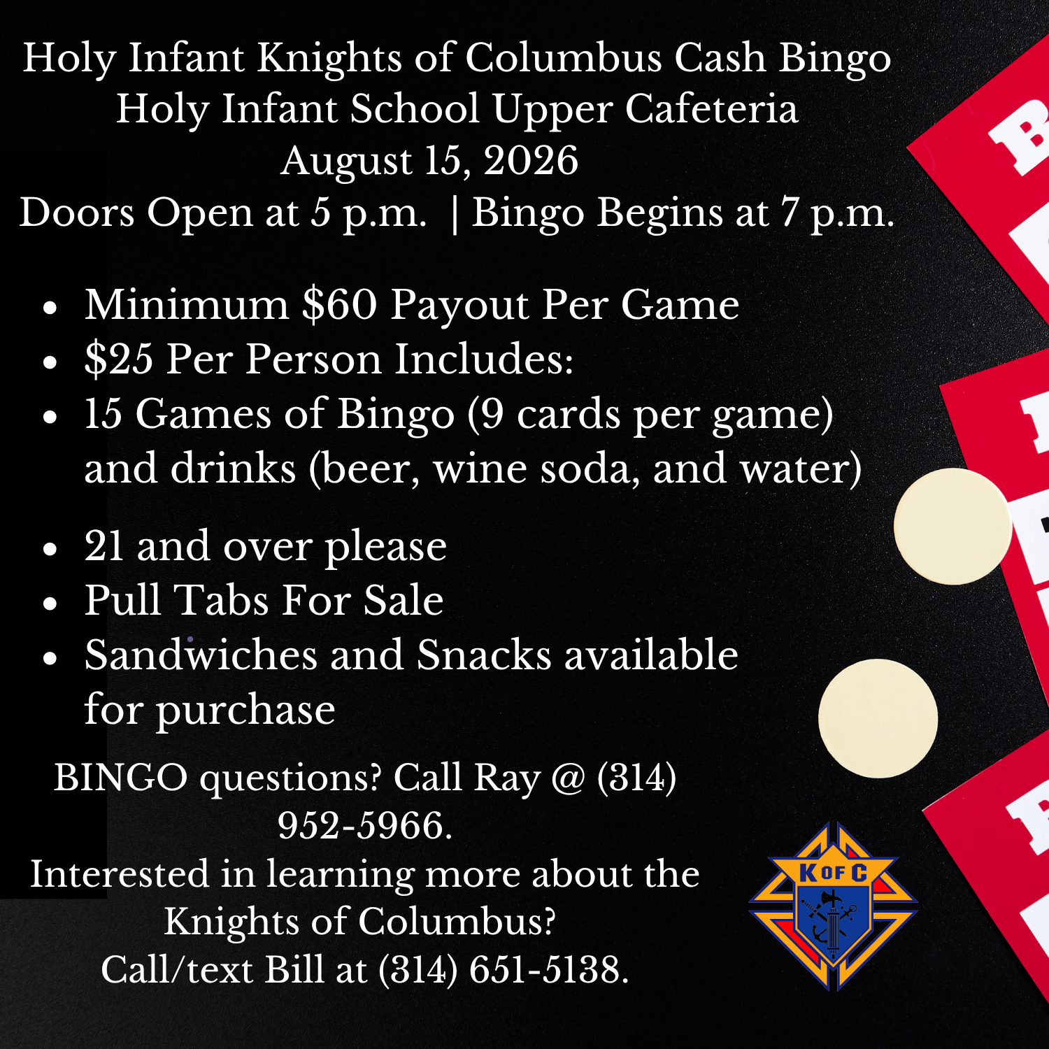 Categories Athletics Youth Tags basketball cyc golf registration Agenda Agenda Day Month Week August – September 2026 Aug – Sep 2026 Collapse All Expand All Aug 15 Sat Bingo Tickets Aug 15 @ 7:00 pm Aug 19 Wed Confession Tickets Aug 19 @ 10:00 am – 11:00 am Rosary @ Chapel Tickets Aug 19 @ 7:00 pm – 8:00 pm Aug 20 Thu Confessions Tickets Aug 20 @ 6:30 pm – 7:30 pm Aug 26 Wed Confession Tickets Aug 26 @ 10:00 am – 11:00 am Rosary @ Chapel Tickets Aug 26 @ 7:00 pm – 8:00 pm Aug 27 Thu Confessions Tickets Aug 27 @ 6:30 pm – 7:30 pm Sep 2 Wed Confession Tickets Sep 2 @ 10:00 am – 11:00 am Rosary @ Chapel Tickets Sep 2 @ 7:00 pm – 8:00 pm Sep 3 Thu Confessions Tickets Sep 3 @ 6:30 pm – 7:30 pm August – September 2026 Aug – Sep 2026 Subscribe Add to Timely Calendar Add to Google Add to Outlook Add to Apple Calendar Add to other calendar Export to XML