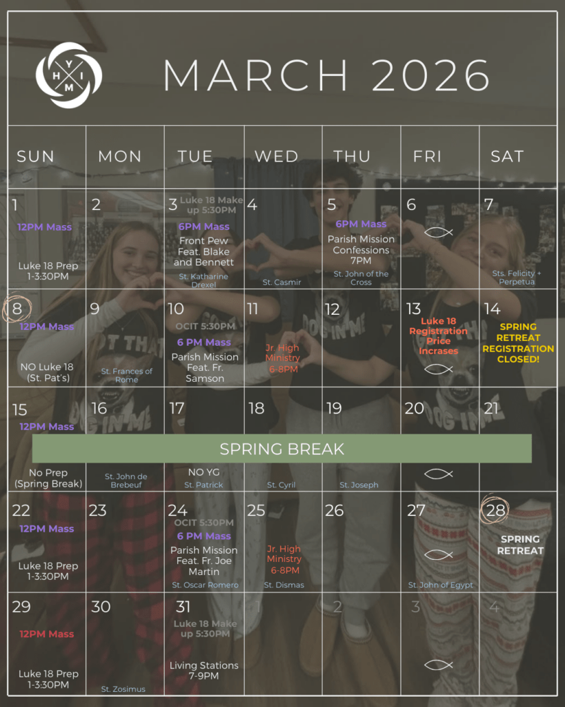 7. I want to contribute to the youth ministry program but do not have that much time to give. How can I help? We would love to have a list of parishioners to call on when we need the occasional help on retreats with providing meals or transportation. We would also love to have a group of parishioners committed to praying for our teens this is called our “Friends of HIYM”. If either of these sound like something you would want to be a part of, contact our youth minister, Alex Stenberg.